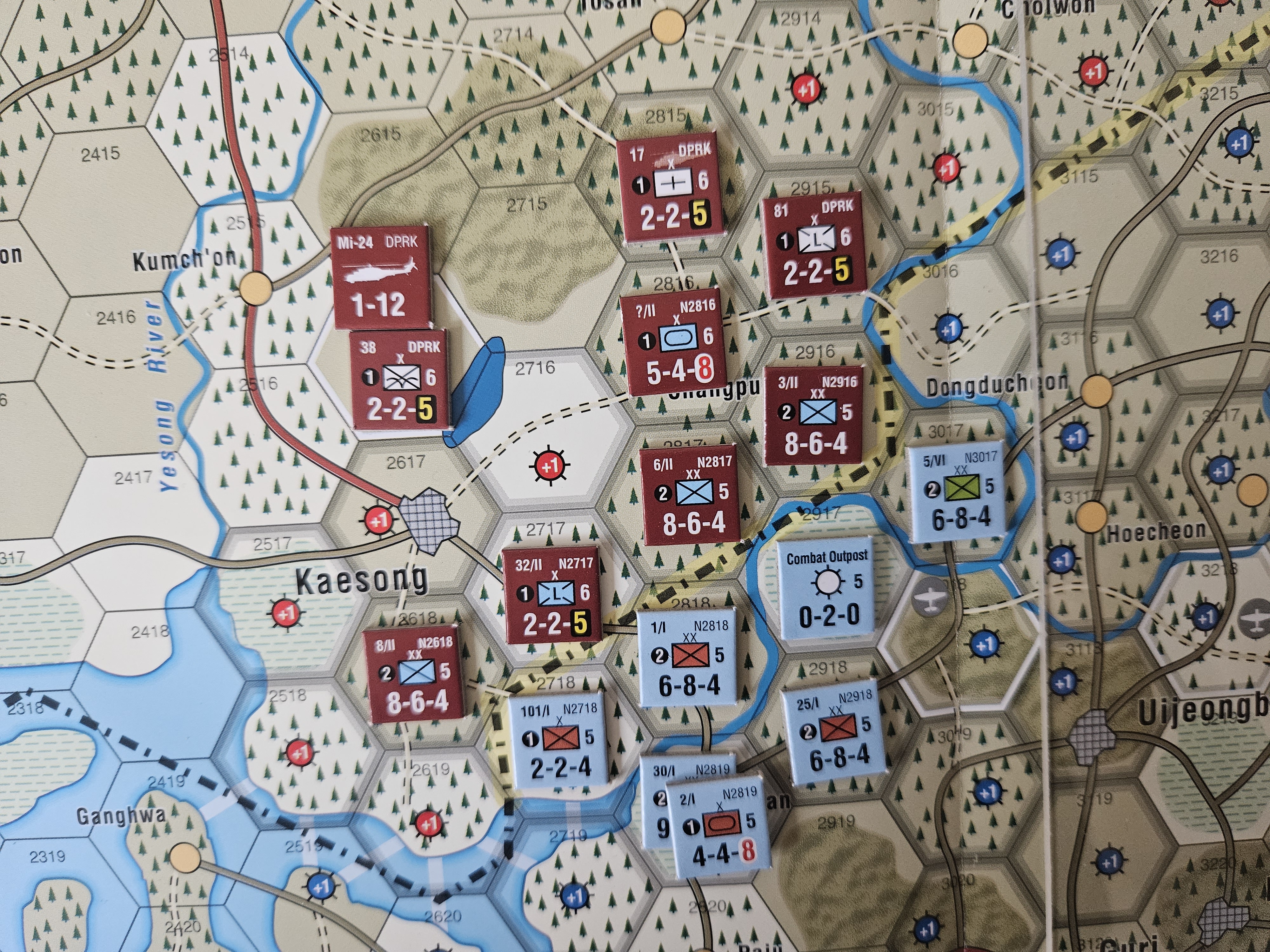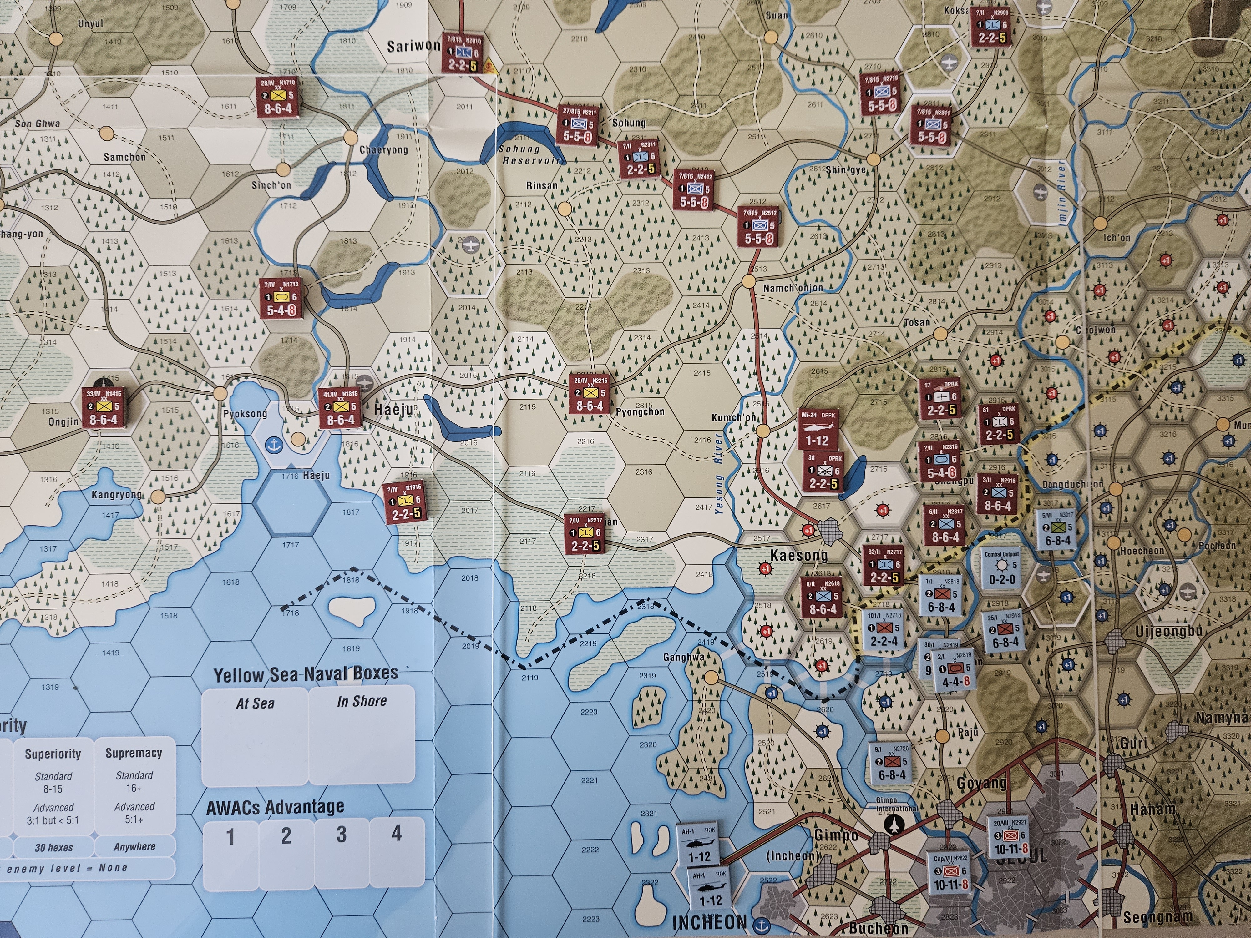 본 시나리오 특수룰 상 가장 동측의 5사단은 이동불가로, 후퇴결과가 나오면 스텝로스를 당하도록 되어 있다. 과연 휴전선 철책을 지키는 부대들은 어느정도 버틸 것인가?