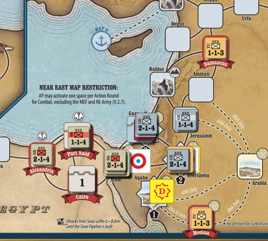 예루살렘의 CP군에게 공격 마커가 놓인다. 그리고 에센(Essen)에서 대기하던 독일 17, 18군이 각각 세당과 브뤼셀로 이동한다. 이것은 사실 보험이다. 중동 전선에서 실패하더라도, 서부전선에서 영국군을 공격하여 RP를 소모시킬 생각이다.