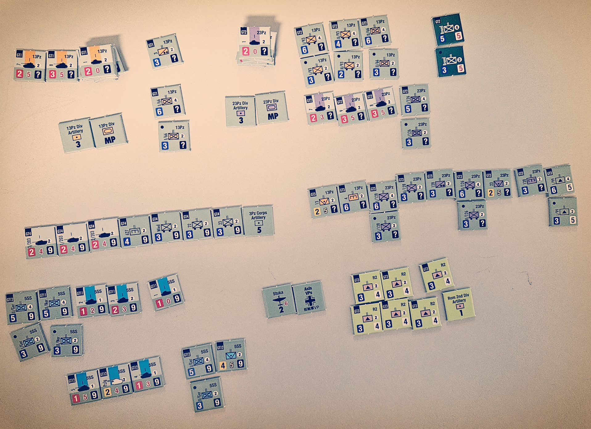 전차는 중대단위, 보병은 대대단위로 표현되어 있는데 공병, 대전차포 등 다양한 병종들로 구성되어 있습니다. 4스텝짜리 부대는 2스텝을 손실할 경우 2스텝짜리 카운터로 교체해야 합니다.