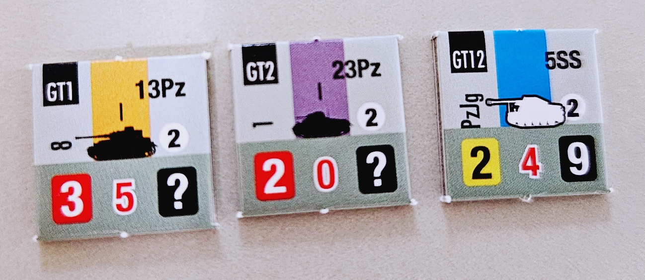 전투 방식도 특이한데, 먼저 방어 측이 CRT에 따라 사격하고 이후 공격 측이 사격하게 됩니다. 또한 목표에 전차가 포함되어 있는지 여부에 따라 공격수정치가 달라집니다.