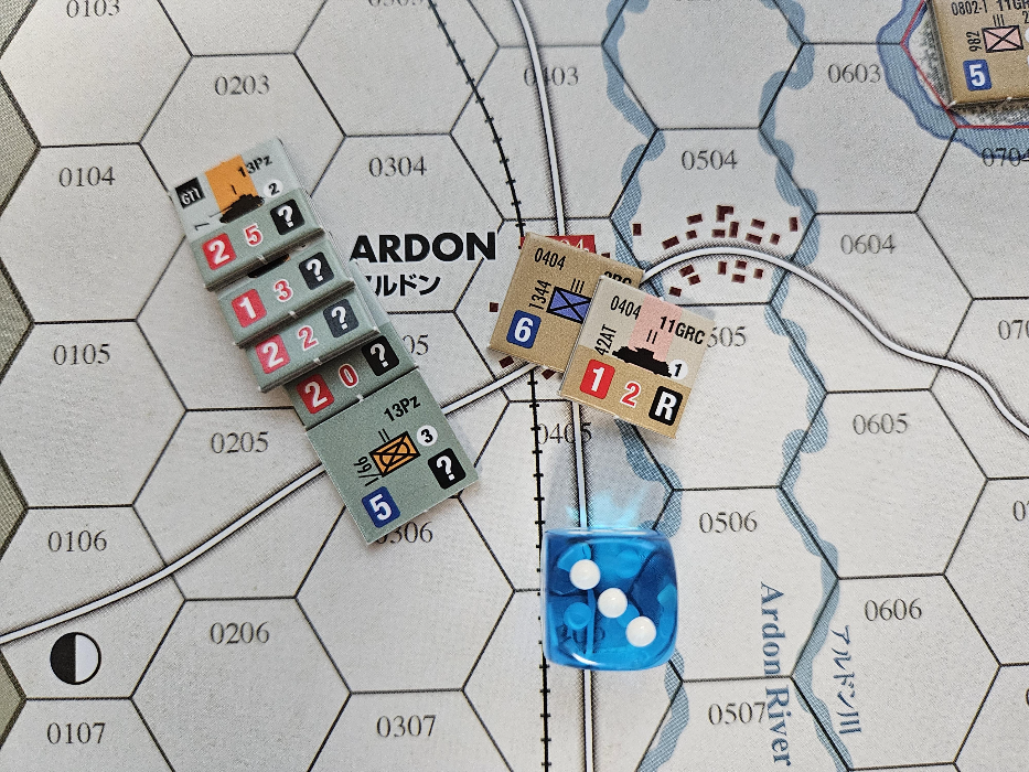 또한 사격할 때 상대방 스택에 전차가 있는지 여부 및 사격하는 유닛의 병종(전차, 대전차포, 보병)에 따라 전투력에 일정 비율을 곱하여 전투력을 산정하게 되는데, 이러한 계산을 거쳐서 최종 CRT를 결정하게 되므로 자연스럽게 시간이 걸리게 됩니다. 예외 룰로, 자주대전차포 유닛은 공격에 참가할 수는 있고, 전차우세치도 사용할 수 있으나 전투력을 가산할 수는 없다는 점은 신경써야 할 부분입니다. 자주대전차포 및 대전차포 유닛은 방어용이라는 점을 구현한 룰인 것으로 보이는데, 복잡한 부분입니다.