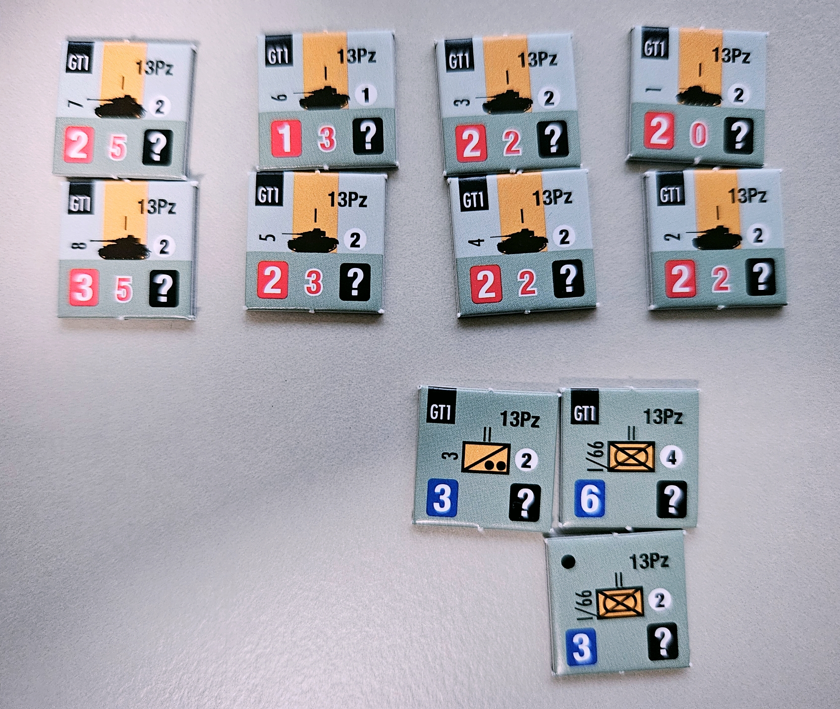카운터 중앙 하단의 숫자는 전차우세치로, 상대방에게 전차 유닛이 있는 경우, 수치를 비교하여 더 높으면 칼럼에 유리하게 보정이 됩니다. 독일군에서 가장 높은 전차우세치 5를 가진 유닛의 실루엣은 티이거 전차로 보입니다.