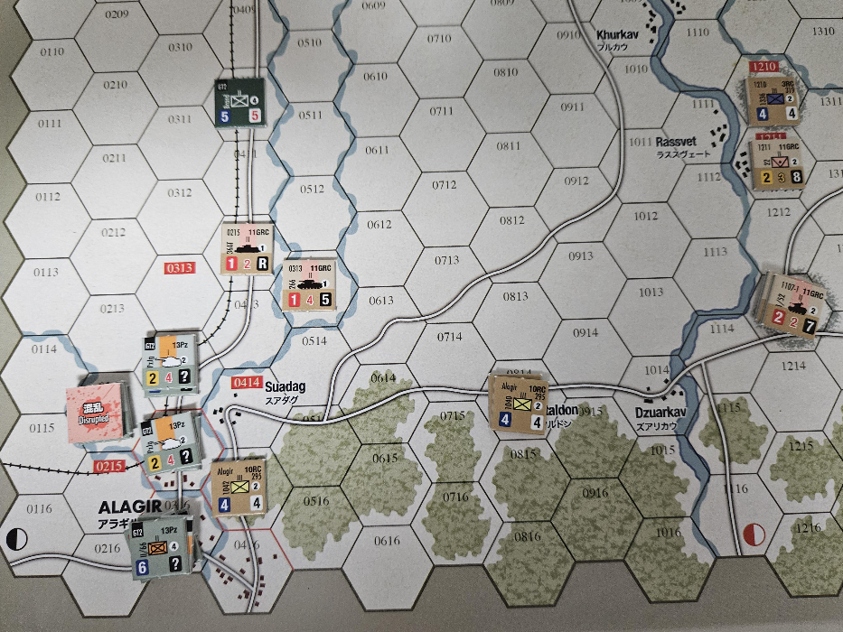 1턴, 독일군은 13기갑사단 유닛들이 지도로 진입합니다. 독일군 유닛은 지도 상에 배치되지 않은 상태로 시작하고, 지도 서쪽 끝단의 보급원으로부터 들어오게 됩니다. 독일군 보급원은 총 2곳으로, 북쪽과 남쪽에 존재합니다. 즉, 플레이어의 선택에 따라 부대를 나누어서 들어올 수 있습니다. 처음 플레이를 하다보니 두 곳으로 균등하게 배분하여 보았습니다. 이에 맞서는 소련군 유닛은 양과 질 모두 독일군의 상대가 되지 않습니다.