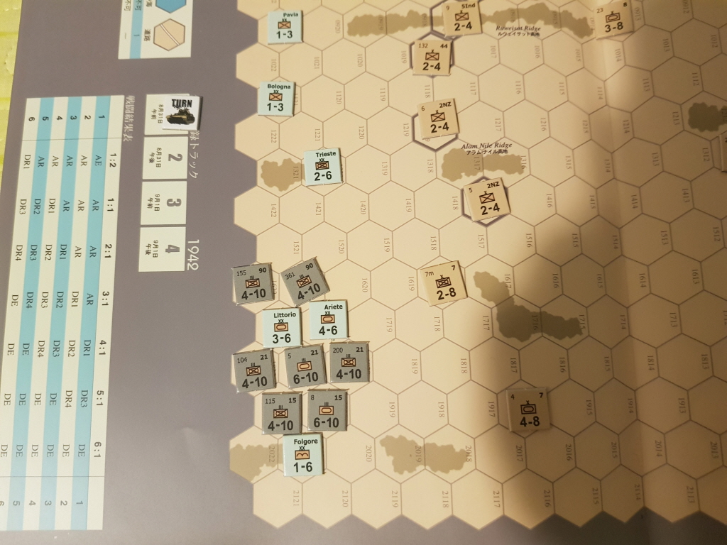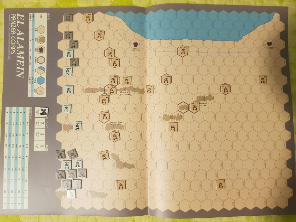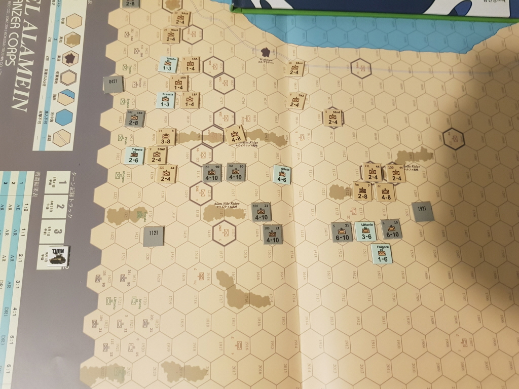 엘 알라메인 전투는 1차와 2차로 나누어지는데, 이 게임에서는 2차 전투의 시작인 독일군의 공세에 해당하는 1942년 8월 31일부터 9월 1일까지 2일간의 전투를 다룹니다. 턴수는 하루를 오전/오후로 나누어서 총 4턴까지밖에 없기 때문에 플레이타임이 짧은 편입니다.