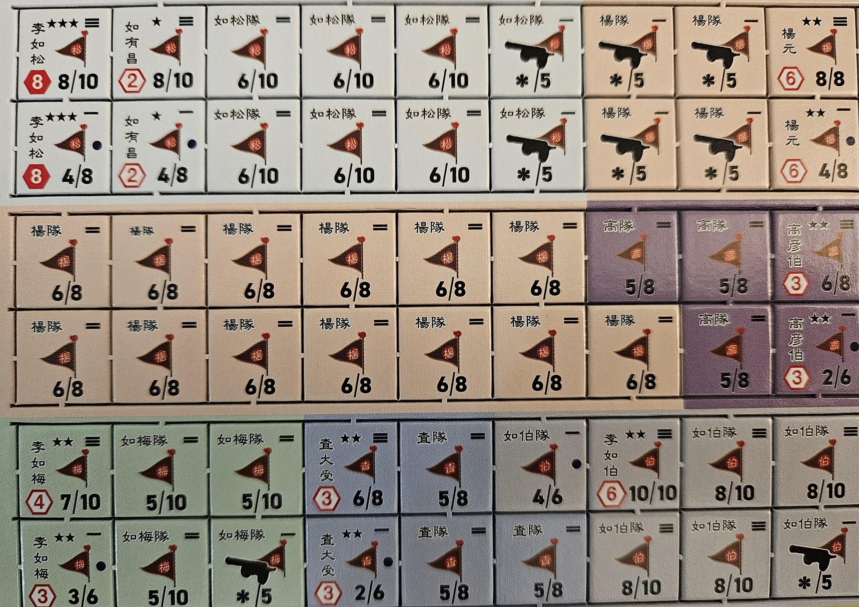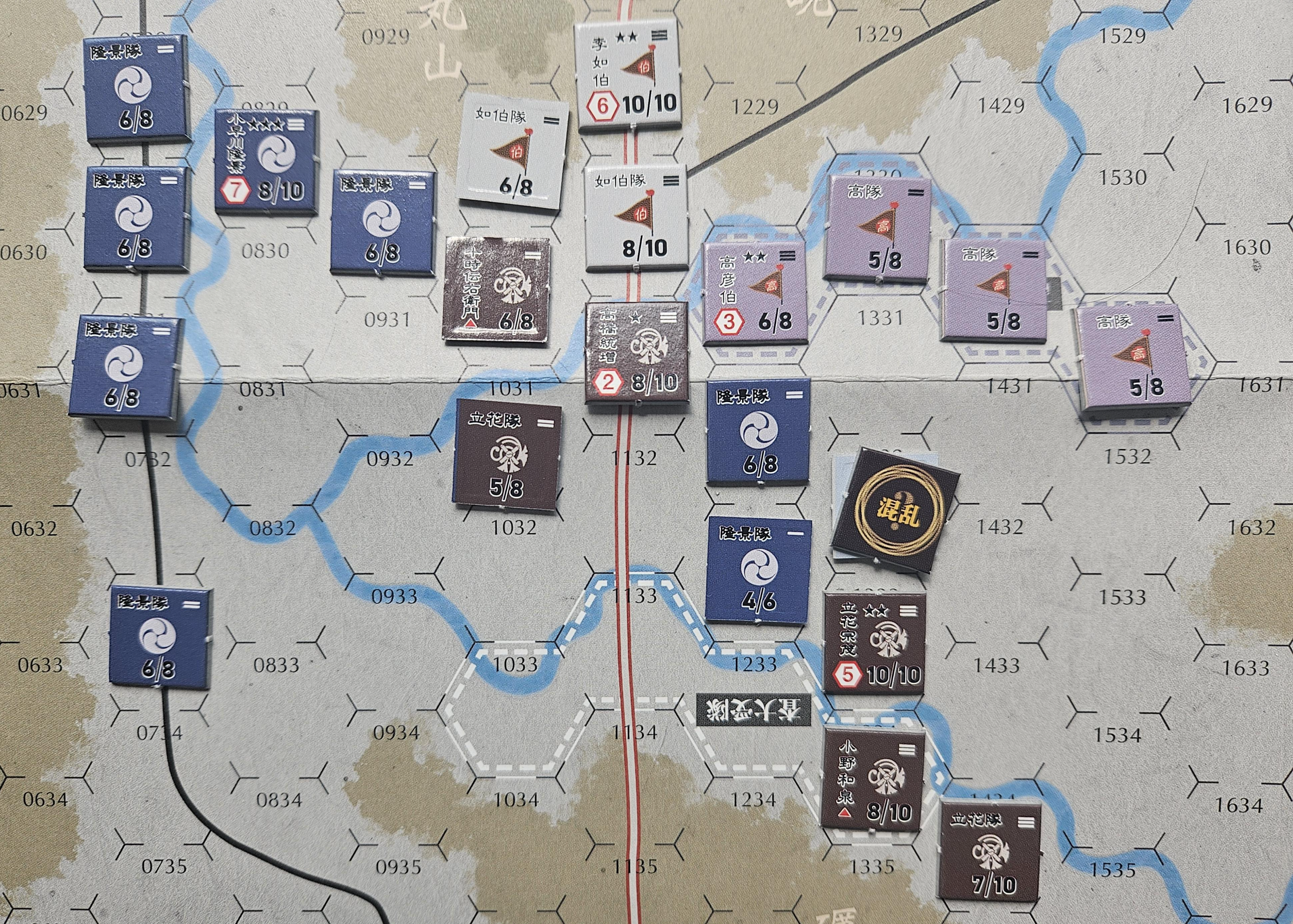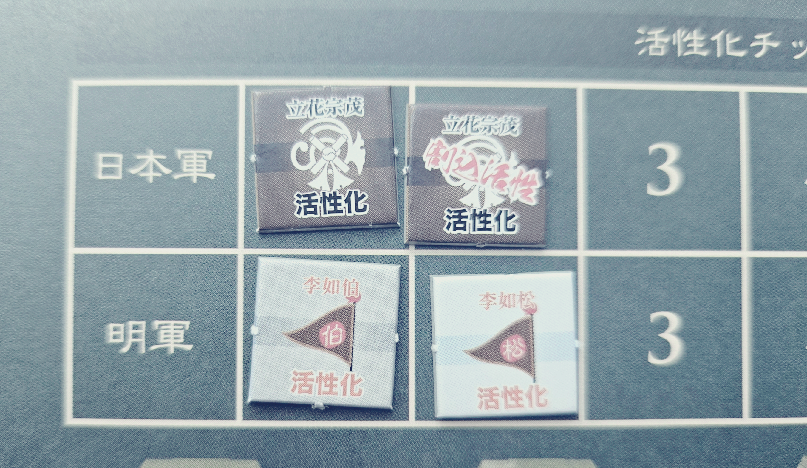 게임 시스템은 활성화 칫을 통해 활성화된 부대가 이동-전투하는 방식인데, 랜덤하게 칫을 뽑는 것은 아니고 턴 개시 시점에 양 플레이어가 상대방 모르게 턴마다 정해진 숫자만큼의 활성화칫의 순서를 미리 정하는 방식입니다. 예를 들어, 1턴은 양측이 각각 두개의 활성화칫을 사용할 수 있습니다. 그리고 1턴 특수룰로, 일본군은 타치바나 무네시게 부대 활성화칫 두장을 사용하도록 되어 있는데 애초에 맵에 나와있는 부대가 그것밖에 없기 때문입니다.