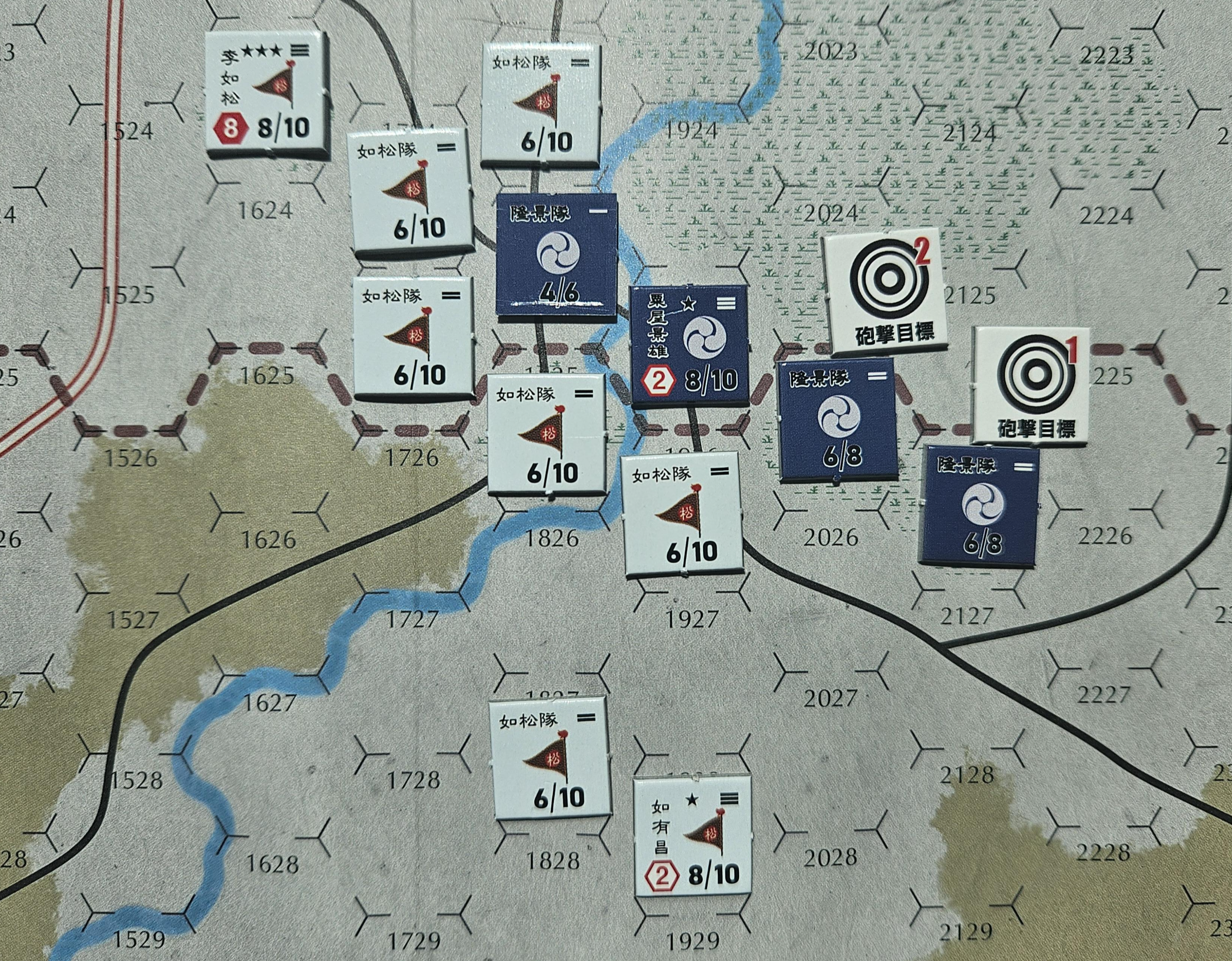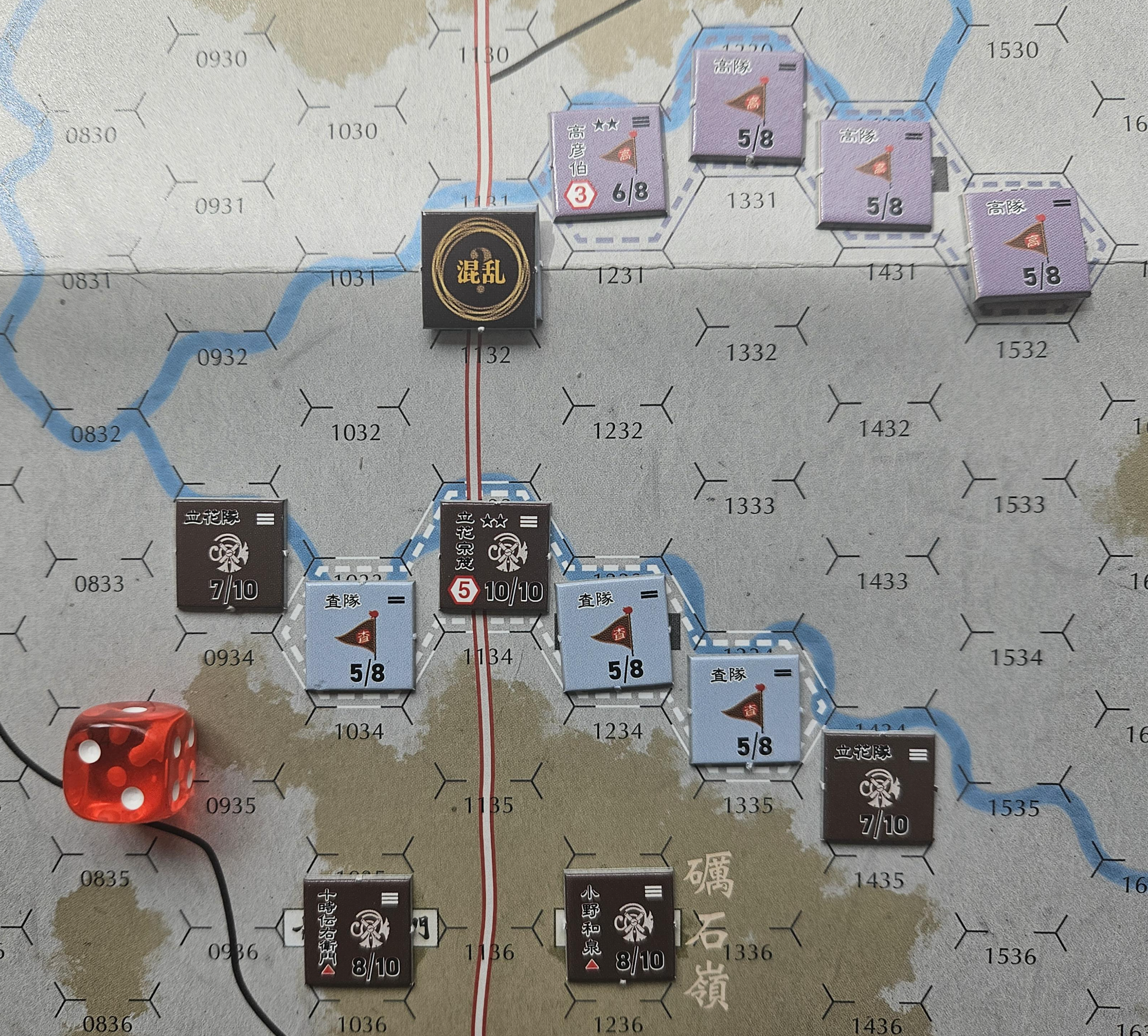 일본군의 증원 역시 마찬가지로 도로를 위주로 이동할 수밖에 없었는데, 동쪽에서 진입한 부대는 이여송 부대의 공격을 받아 피해를 입게 됩니다. 이 때, 명군은 특수한 유닛인 대포 부대를 사용하여 "포격"을 해 보았습니다. 대포 부대는 평지라면 8칸 떨어진 곳까지 포격을 할 수 있는데, 주사위 2개를 굴려 나온 눈에 따라 목표 지점에 명중하거나, 아니면 주변 헥스에 포격이 가해질 가능성이 있습니다. 만약 주사위눈의 합이 7이 나오면, 대포 유닛은 쏴 보지도 못하고 파손되어 제거된다는 점에서 활용도는 운에 좌우될 것으로 보입니다.