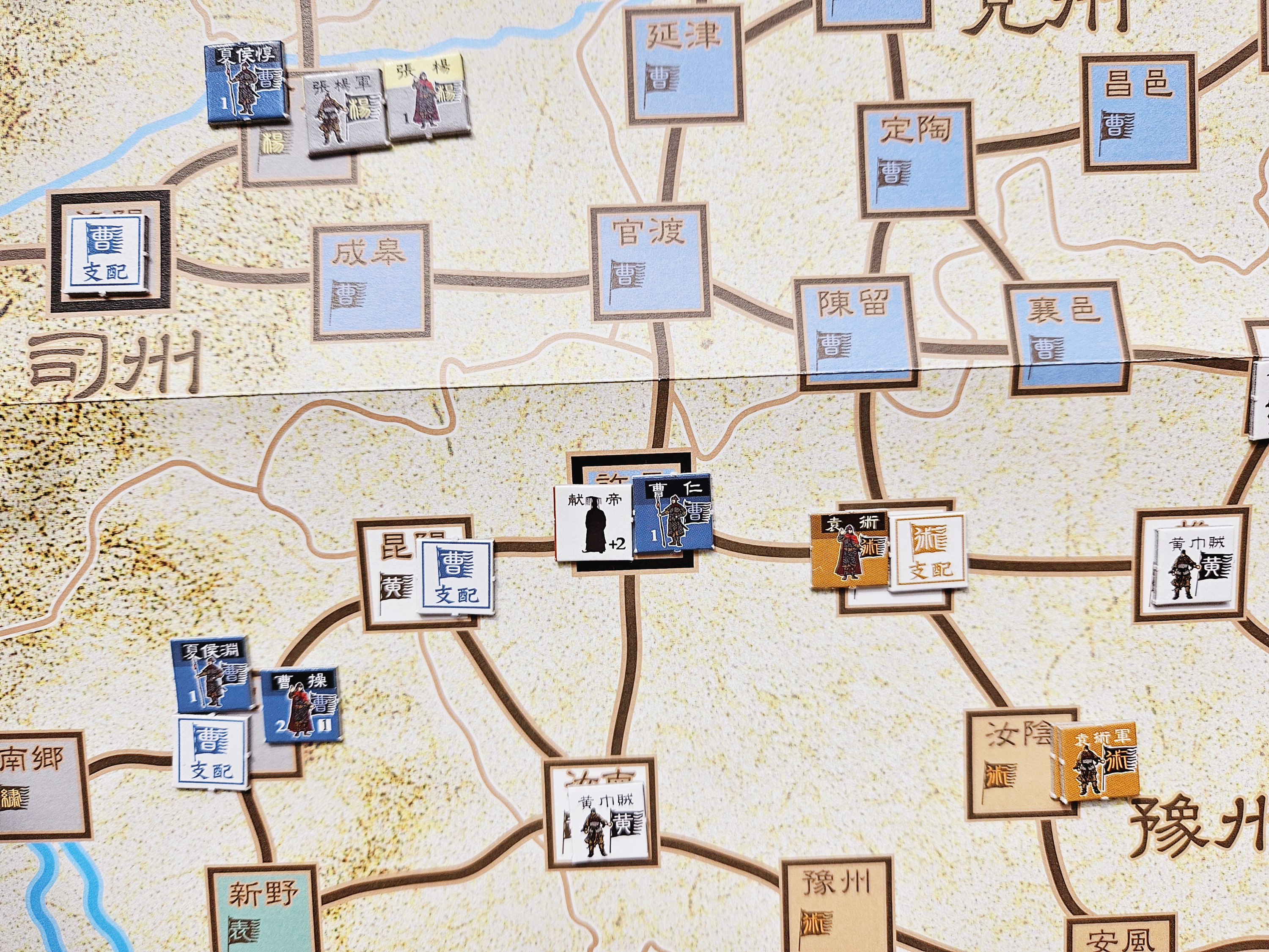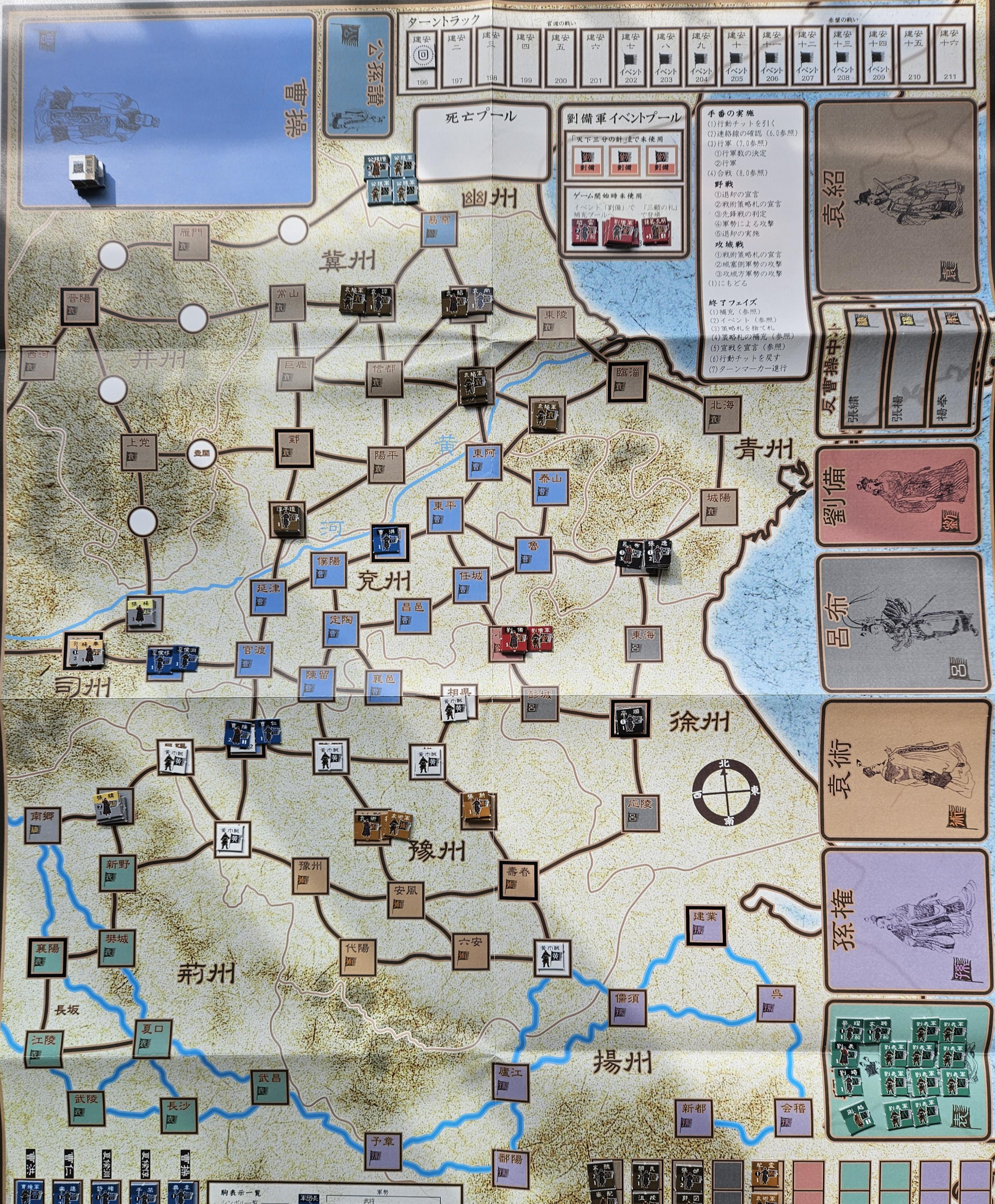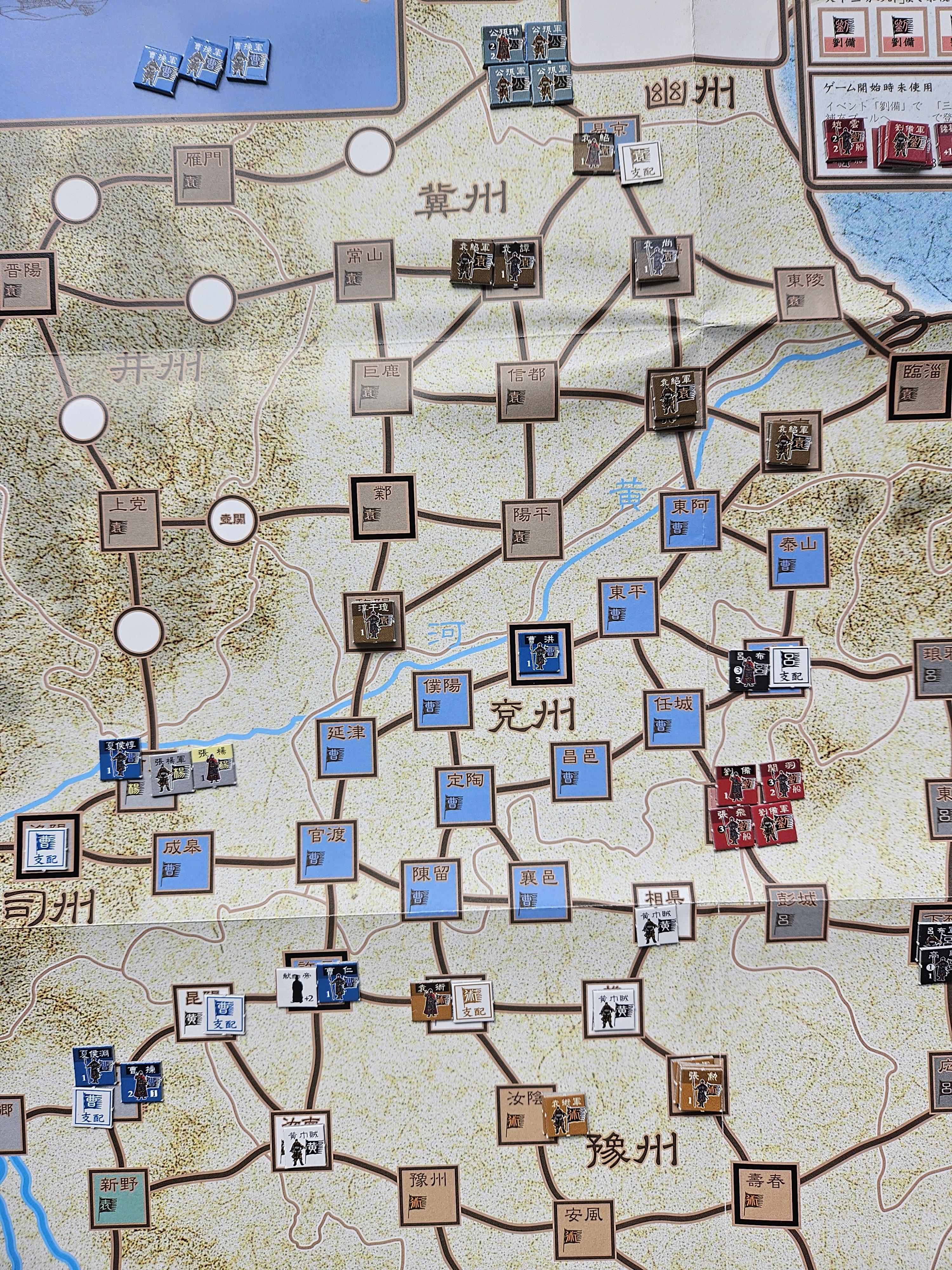 게임 룰은 간단한 편이나, 전투에서 주사위 수정치를 적용하고 많은 숫자의 주사위를 굴리느라 상당한 시간이 걸리게 됩니다. 적 지배 하의 지역으로 군세가 진입하면 일단 멈춰야 하기 때문에, 조조군 입장에서는 동쪽의 지역들을 여포가 점령하는 틈을 타서 중소세력과 상대적으로 능력치가 낮은 원술 군을 공격하는 것이 적절해 보입니다. 특히 적 지역을 점령하면 책략 카드도 얻게 되니 일석이조라고 할 수 있어 보입니다. 물론 원활한 진격을 위해서는 일정 수준 이상의 행동력이 보장되어야 할 것이지만...