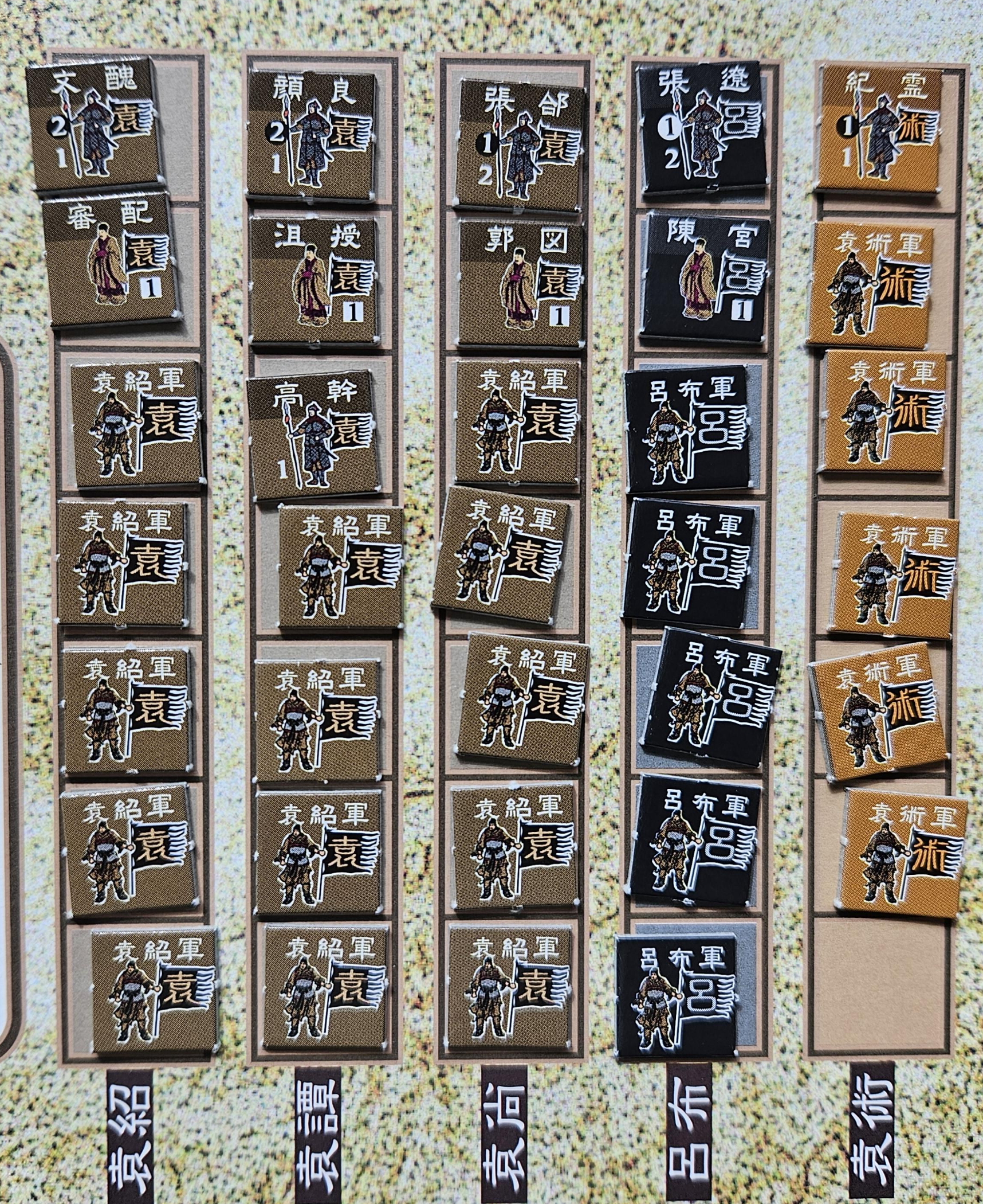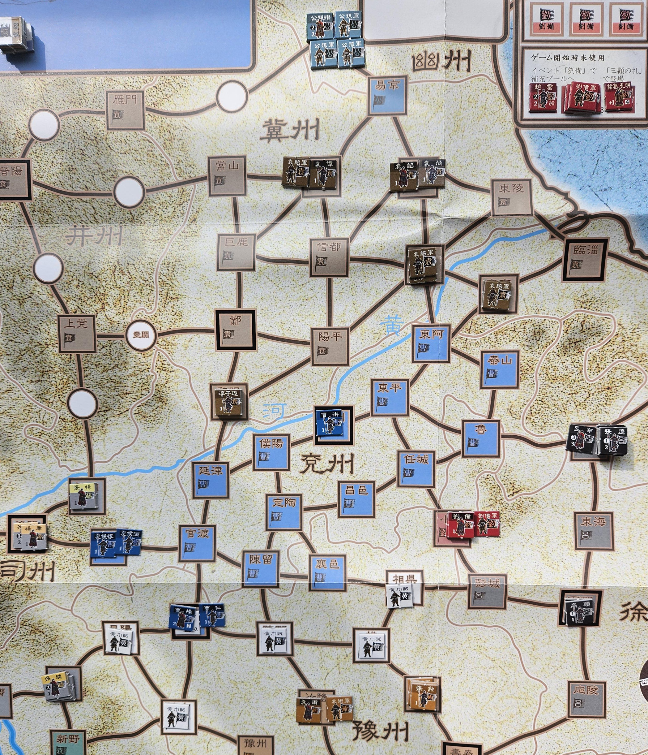한 가지 재미있는 점은 여포, 원술, 원소 등의 세력이 조조에게 멸망당할 경우, 그 세력의 유닛은 이제 조조군의 보충 유닛으로 사용할 수 있게 된다는 것이었습니다. 애초부터 유닛 뒷면이 조조군 색깔로 되어 있는데, 조조가 상대 세력을 흡수하면서 점점 강해지는 모습을 구현한 것으로 보입니다. 이에 대응하는 반 조조 세력의 경우, 원소가 중간보스라면 최종 보스는 이벤트 칫을 통해서 참전하는 유표, 손권, 유비가 될 것입니다. 특히 유비군은 유닛 숫자는 적지만 무장의 능력치가 높다는 점(관우, 장비의 선봉전 수정치는 게임 중 가장 높은 수치인 3입니다.)에서 조조군의 대항마가 될 것입니다. 참고로 제갈량은 유비 이벤트 칫이 세 장 뽑히면 등장합니다.