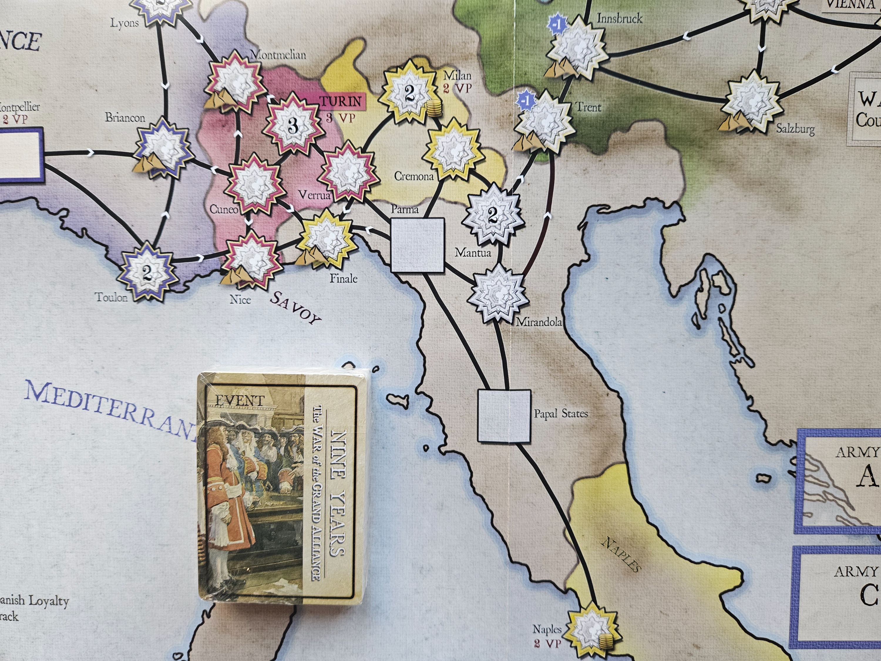 사실 이 게임은 스페인 왕위계승전쟁을 다룬 워게임 No peace without Spain 1702-1713의 프리퀄에 해당하는 게임으로서, 게임 시스템도 거의 동일합니다. 보드게임긱의 리뷰에 의하면 전작의 평가가 더 높은 듯 하나, 특이한 점으로 두 게임을 모두 보유하고 있다면 연결하여 캠페인 게임을 할 수 있습니다.