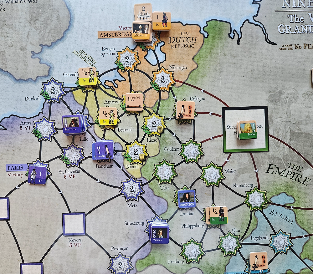 제목인 9년 전쟁 그대로, 1688년부터 1697년까지 프랑스 부르봉 왕조와 그에 맞서는 스페인, 영국, 오스트리아 등 연합국 사이의 전쟁을 다룬 게임입니다. 참전국을 보면 거의 유럽의 모든 국가들이 참전하였다고 해도 과언이 아닐 것입니다. 워게임에서 그다지 인기가 없는 생소한 배경이지만, 그렇기에 플레이해볼 가치가 있는 게임이기도 합니다.