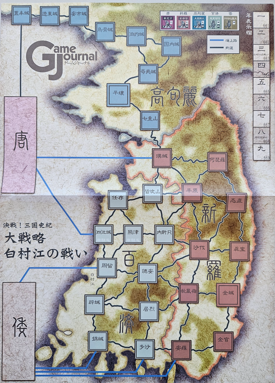 이번에 살펴볼 보드게임은 일본 워게임 잡지인 게임저널 제15호 부록게임인 대전략 백촌강의 전투 입니다. 백촌강의 전투란 우리나라에서는 백강 전투라고 불리는데, 660년 백제 멸망 후 백제부흥군이 일어난 후 663년 8월 현재의 금강 하구에서 신라-당 연합군과 백제-왜 연합군이 벌인 전투입니다. 이 게임은 삼국시대의 막바지인 661년부터 669년 사이, 제2차 및 제3차 고구려-당 전쟁이 벌어지고 백제와 고구려가 멸망으로 향하는 시기를 배경으로 하고 있습니다.