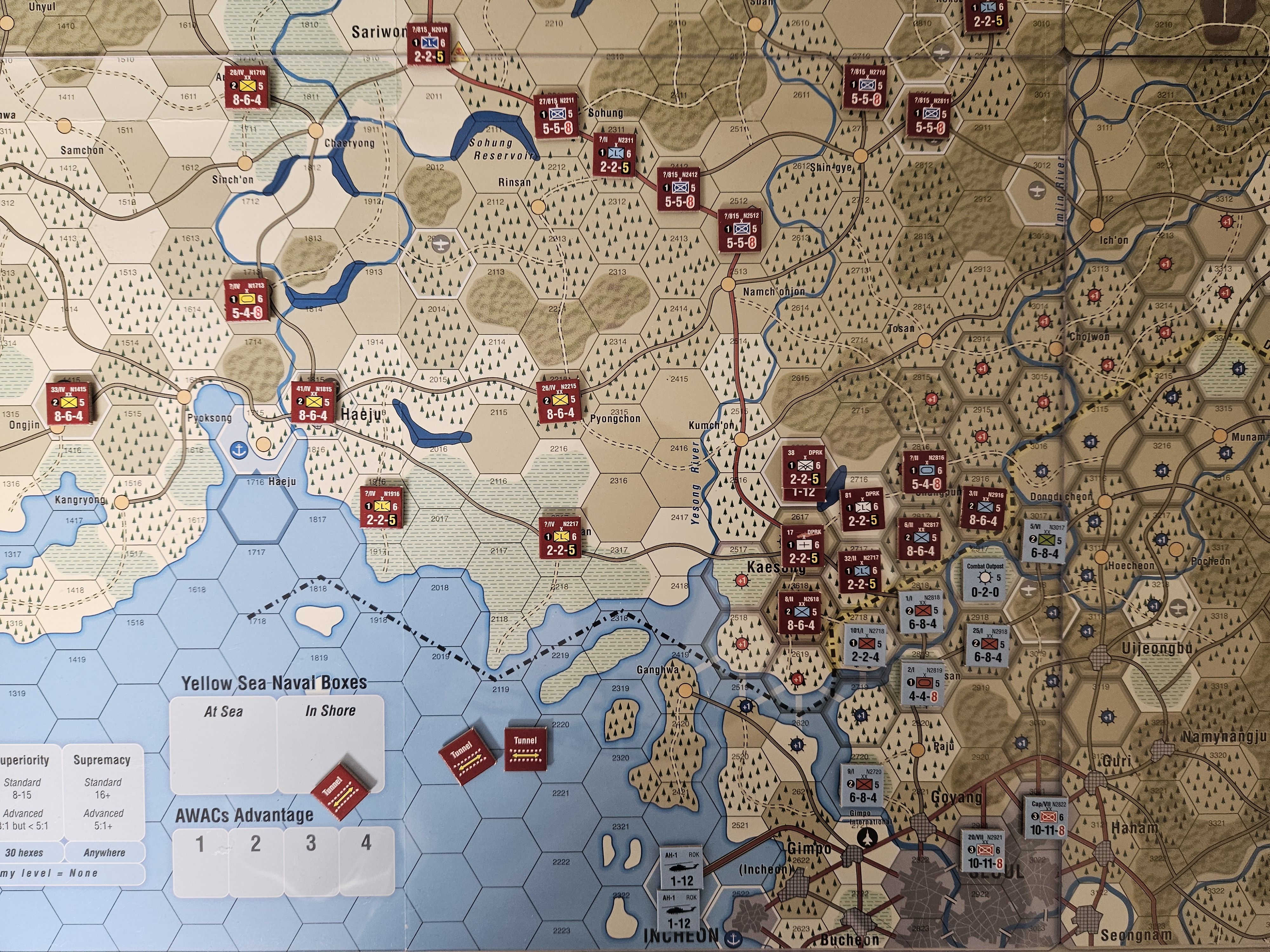 시나리오상 1턴과 2턴은 북한군의 항공우세(Air Advantage)를 가져갑니다. 이 게임이 현대전을 배경으로 하고 있다는 사실이 크게 느껴지는 부분이 바로 제공권과 관련된 부분인데, 각 턴마다 제공권을 누가 가지고 있는지 및 항공 포인트(Air point)를 얼마나 가지고 있는지 여부가 굉장히 강력하다는 점이었습니다. 예를 들어, 전투 시 항공 포인트를 지상지원에 사용할 수 있는데 최대 4포인트까지 할당할 수 있고, 대공사격으로부터 살아남은 포인트에 따라 유리한 DRM 보정을 받게 됩니다. 여기에 더해서 공격헬기를 최대 2부대(방어측은 최대 1부대) 할당하게 되는데, 대공사격 판정 결과에 따라 전투력이 DRM 보정에 반영됩니다.