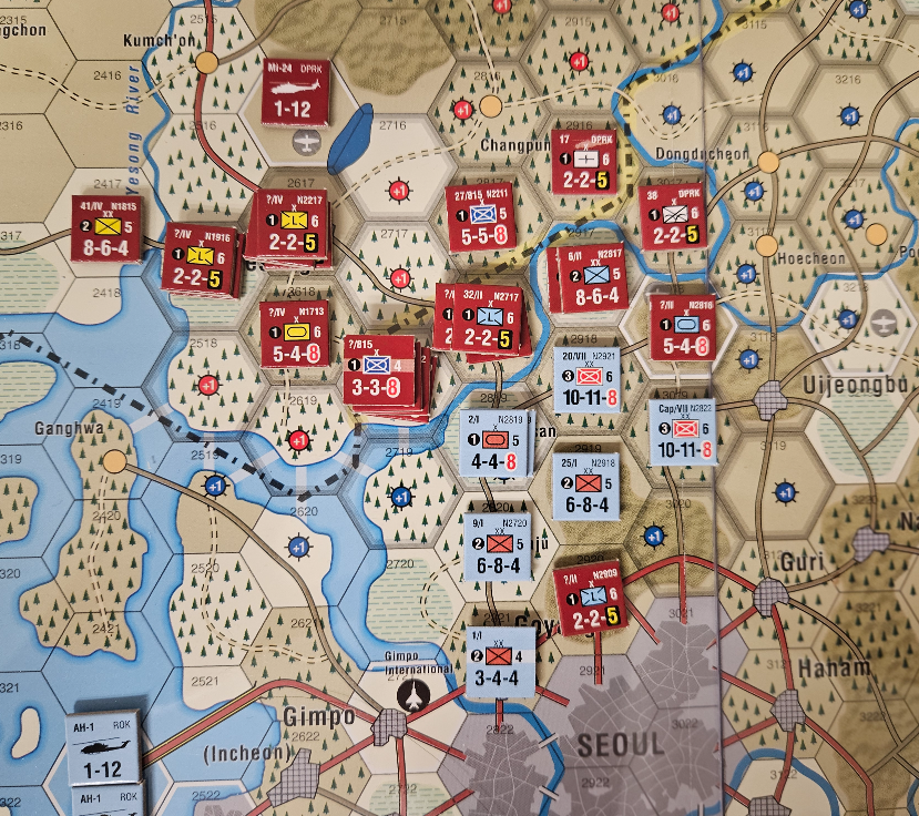 시나리오상 2턴까지도 북한군의 항공우세 상태이고, 3턴부터 경쟁(Contested) 상태로 변화하기 때문에 아직 한국군의 헬기부대를 전투에 투입하기 어려운 상태인데, 한국군으로서는 방어에 유리한 지형인 서울까지 물러나야 할 것으로 보입니다. 게임의 시스템 상 공격자는 여러 헥스에서 1개 헥스로 공격력을 집중할 수 있는데, 소모전이 될 경우 한국군 유닛이 전부 전멸할 지도 모른다는 생각이 들었습니다.