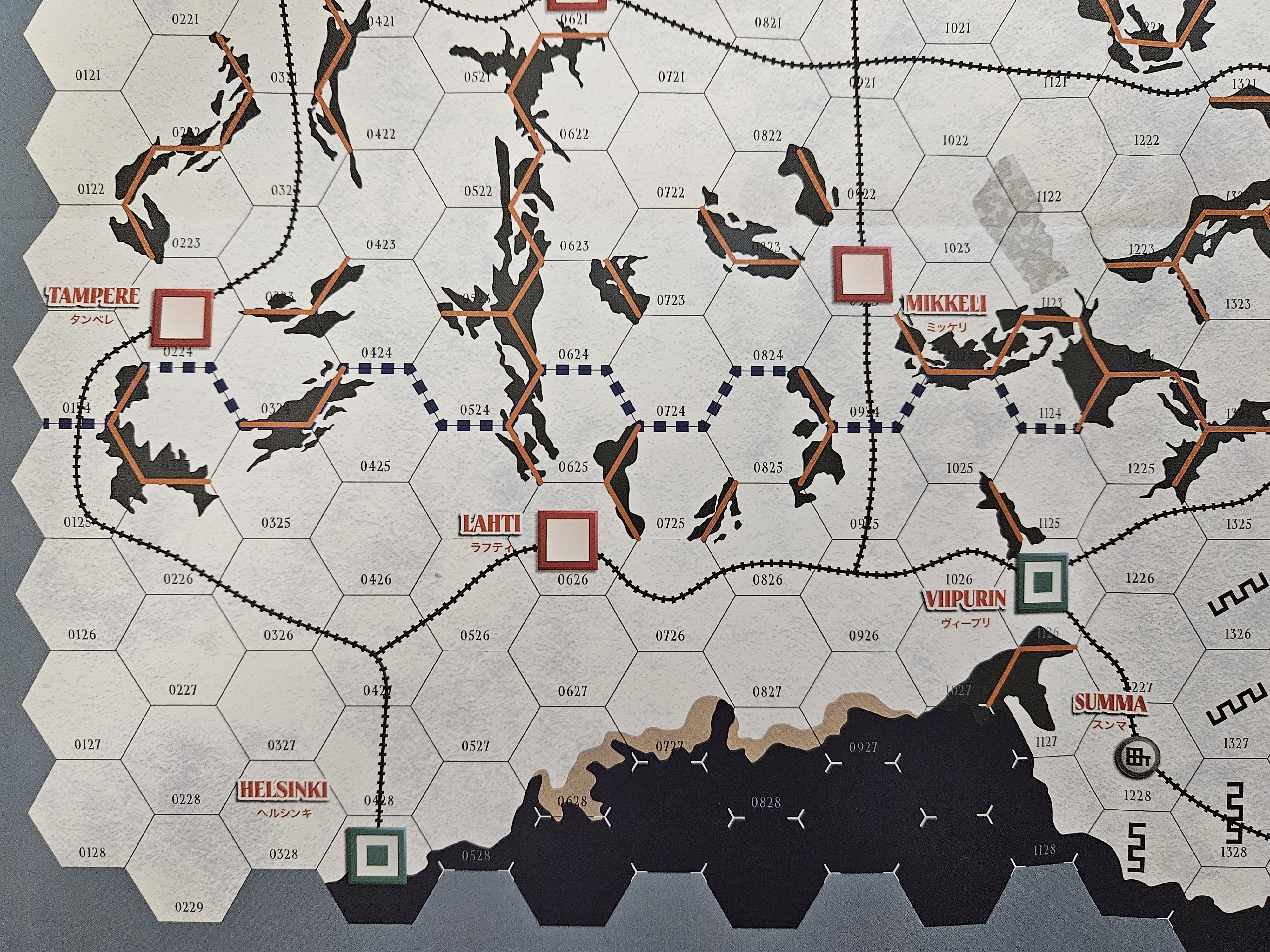 지도는 핀란드 전체를 포함하고 있습니다. 녹색 네모는 대도시, 빨간색 네모는 도시를 나타냅니다. 소련은 핀란드의 도시, 마을 등을 점령하면 승점을 얻을 수 있고, 각 턴별로 정해진 승리점수에 도달하지 못하면 패배하게 됩니다.