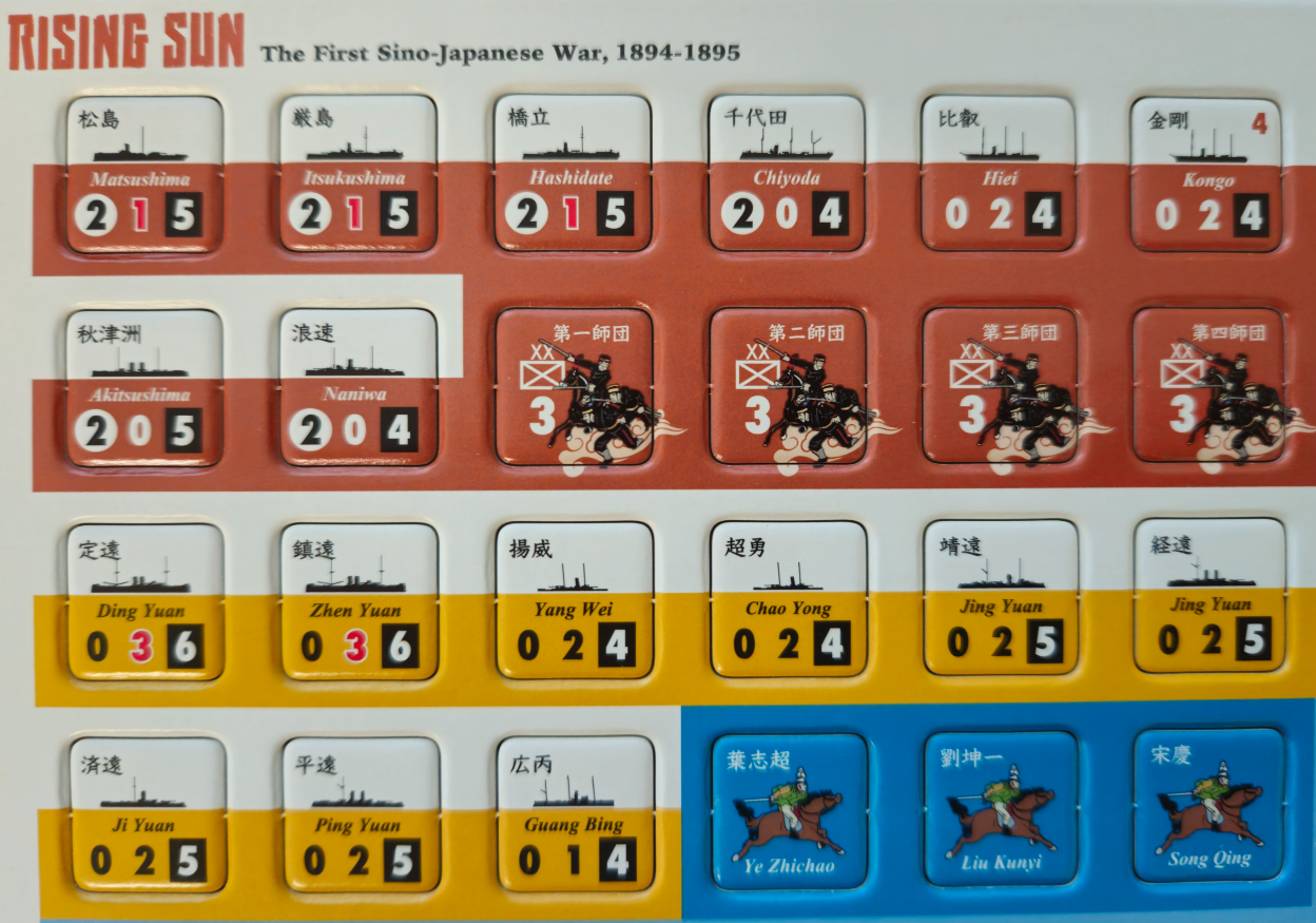 - 카운터는 일본군과 청군의 해군 및 육군 유닛으로 구성되어 있습니다. 해군은 1894년 9월 17일 벌어진 황해 해전에 참가한 군함들이 포함되어 있고, 육군은 일본군은 사단 단위로 구성되어 있으나 청군은 단위에 대한 표기가 없고, 지휘관 유닛 3개(엽지초, 유곤일, 송경)가 포함되어 있습니다.