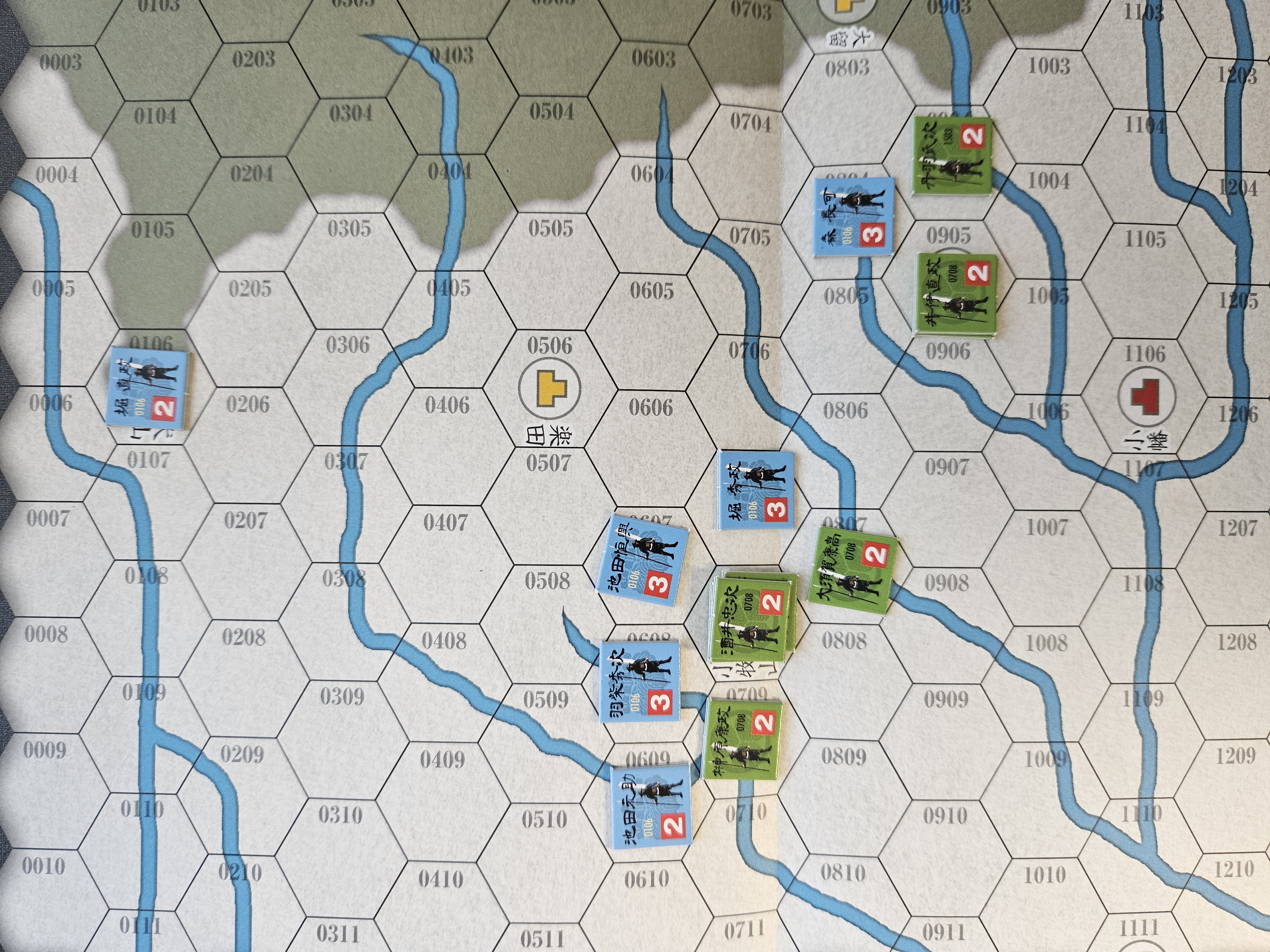 또한 승리 조건은 즉시 승리 조건도 있으나 게임이 종료될 때 지도 상의 성을 더 많이 점령하고 있는 측이 승리하고, 히데요시군 유닛이 지도 동남측으로 이탈할 경우 승점을 득점할 수 있습니다. 룰이 상당히 간단하여 짧은 시간에 플레이할 수 있는 게임으로 보입니다. 다만, 전투 결과가 주사위눈에 따라 크게 좌우된다는 점은 많이 단순하다는 느낌이 들었습니다. 또한 전투 시 모든 유닛이 어떤 조합으로 전투를 진행할 지에 대하여 주도권 플레이어가 결정하여야 하므로 이 부분은 생각하여야 할 부분이 많을 것으로 보입니다.