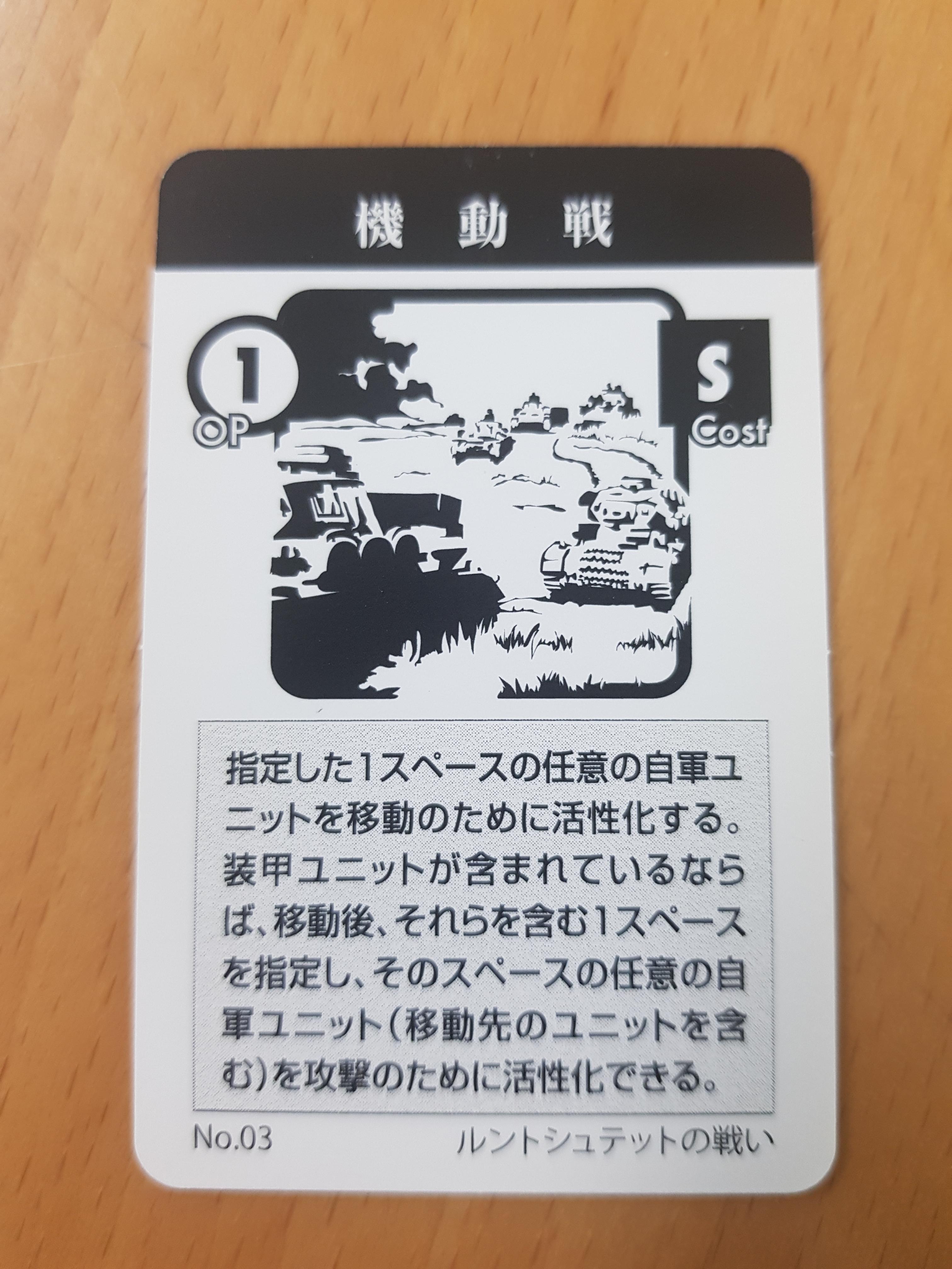카드 드리븐 게임이다보니 카드가 중요한 역할을 하는데, 카드에 써 있는 OP(작전 포인트)를 사용하여 부대를 이동 또는 공격에 사용하기 위하여 활성화시킬 수 있습니다.