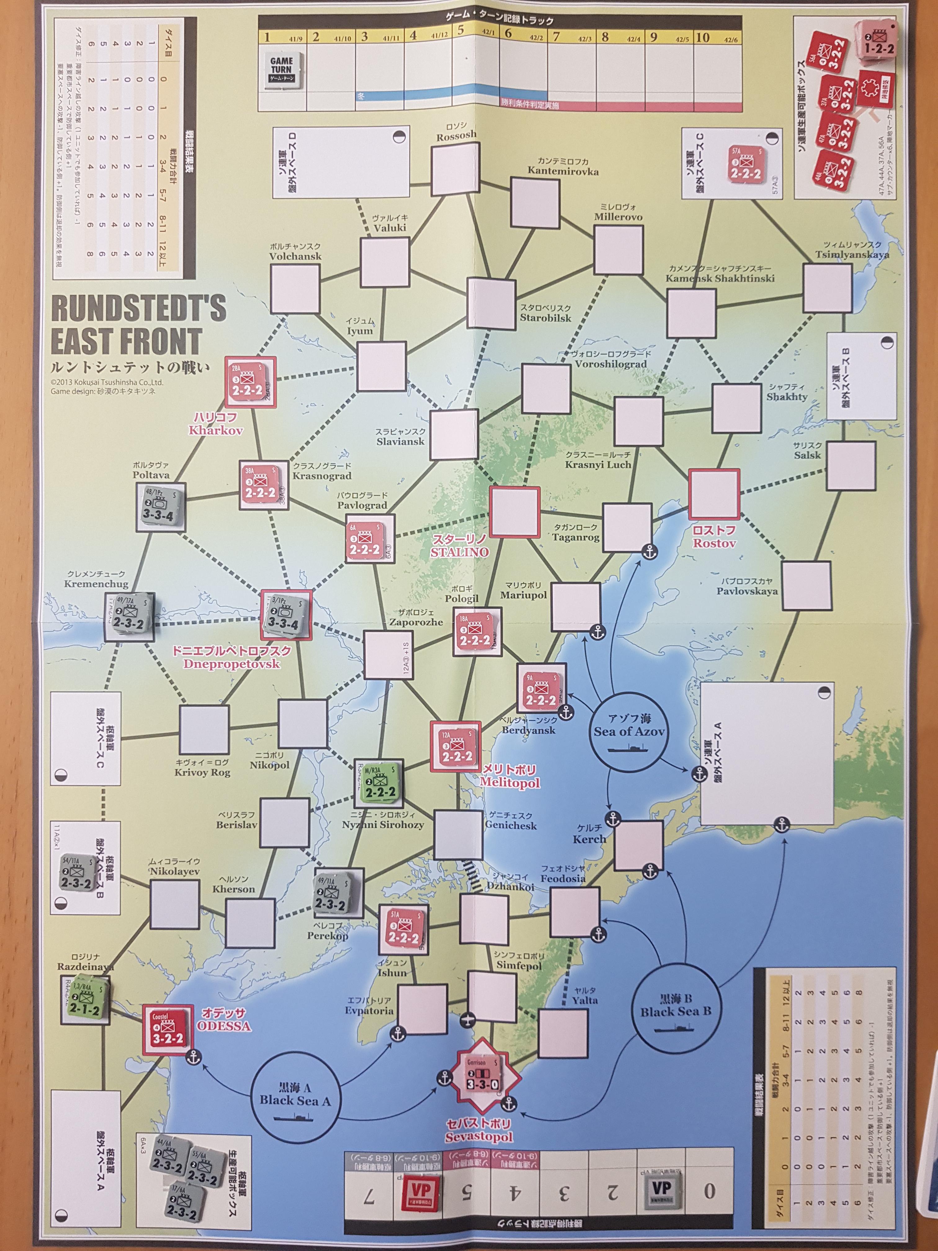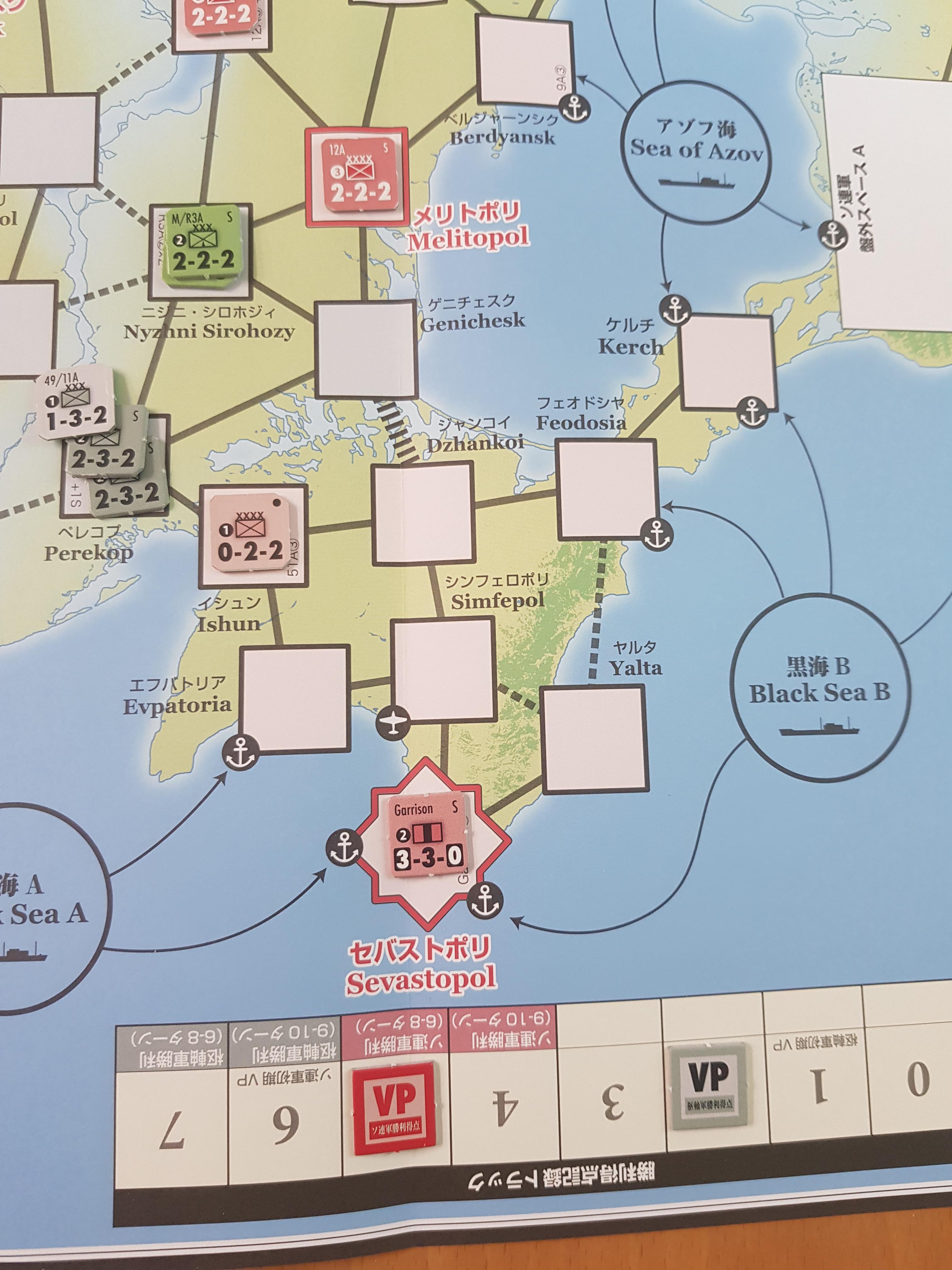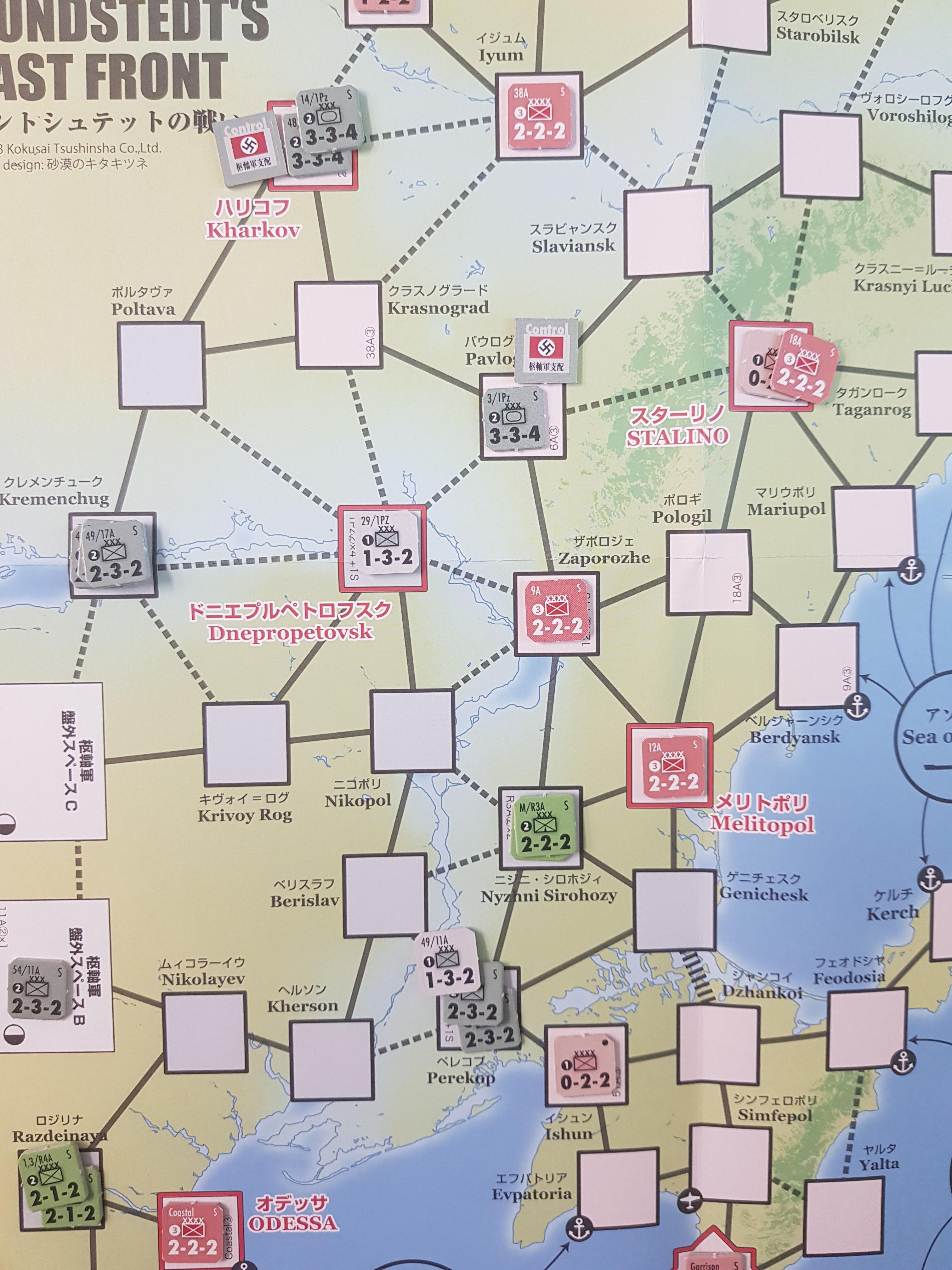 위 지도를 보면, 주요 도시로서 하르코프, 오데사, 멜리토폴 등을 볼 수 있고, 당시 크림반도가 치열한 전장이었음을 알 수 있습니다. 회색 유닛은 독일군, 적색은 소련군, 녹색 유닛은 루마니아군입니다.