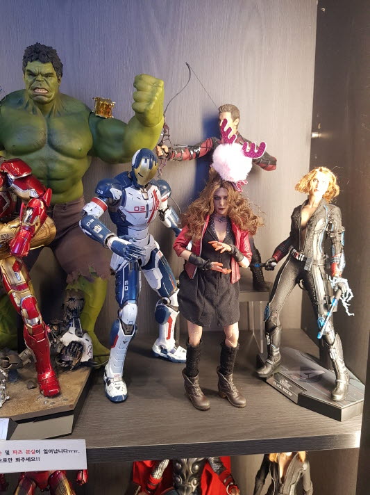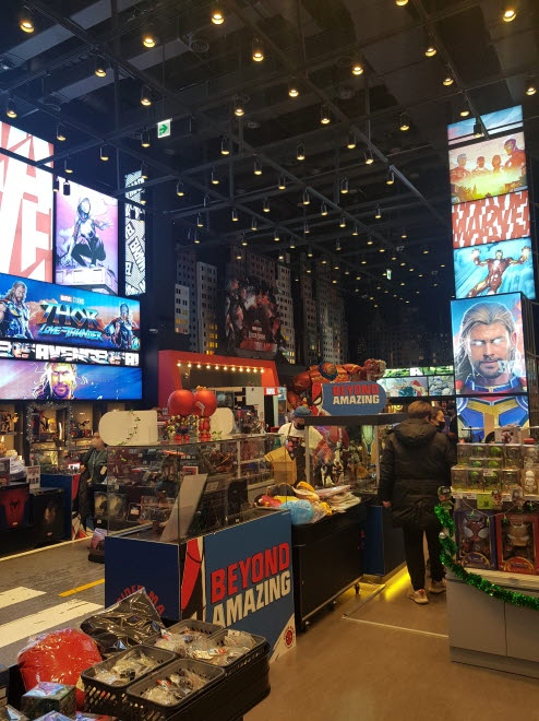 상점 안 진열장에는 영화나 드라마에서 보던 캐릭터들이 마치 현실로 튀어나온 듯 정교하게 만들어진 마블 캐릭터 피규어들이 전시되어 있었는데요, 평소와는 다르게 뭔가 크리스마스다운 모습을 하고 있는 모습이 재미있었습니다.