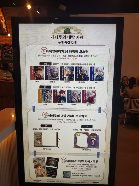 특별한 것을 좋아하는 분들에게는, 파이널판타지14 컨셉으로 꾸며진 카페를 추천드리고 싶네요. 예전에는 케로로 중사 애니메이션 컨셉 카페였었던 것 같은데 계속 컨셉이 바뀌는 카페인 것 같습니다. 게임 팬이라면 더욱 의미있을 것 같은데 아니나다를까 카페는 문전성시를 이루고 있었습니다.