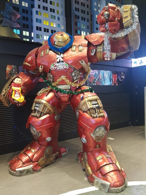 다음으로는 어벤져스로 유명한 마블 세계로 빠져들어가 볼까요? 한 켠에 자리잡은 마블스토어도 크리스마스를 맞이하여 친숙한 캐릭터들이 한껏 치장을 하고 있었습니다. 거대한 헐크버스터 모형이 크리스마스 트리처럼 꾸미고 있는 모습이 눈길을 사로잡았습니다. 저기에 아이언맨이 타고 있는지 모르겠네요.