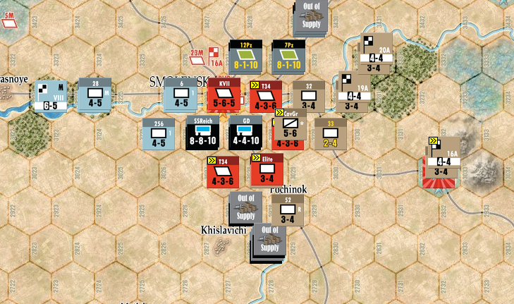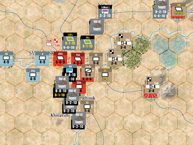 지난 3기갑군의 공격으로 인하여 만약 다음에 보급 칫이 나온다면 스몰렌스크의 소련 2개 부대는 고립 상태가 될 위기에 처했습니다. 스몰렌스크의 T34 기갑부대를 동쪽 빈틈으로 이동시키고, 역습을 시도합니다.