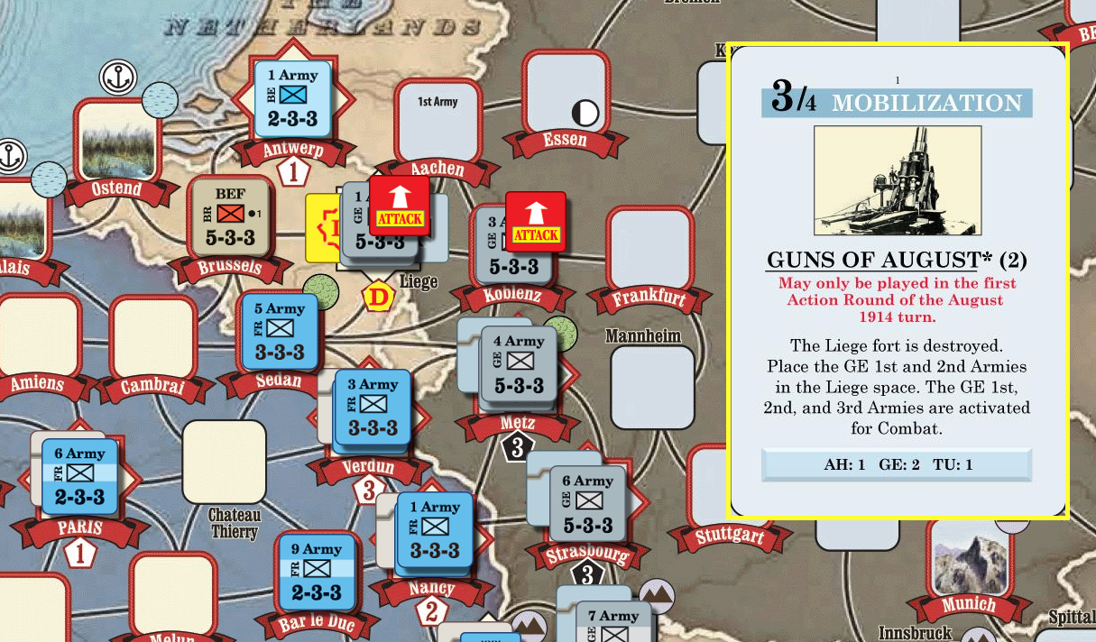 독일을 비롯한 동맹국(The Central Powers)과 프랑스, 영국 등 연합국(Allied)은 저마다 55장의 카드 덱을 가지고 있는데, 이 카드들은 다시 동원, 제한전, 전면전의 세 종류로 나누어집니다. 처음에는 동원 단계의 카드만 사용할 수 있는데, 전쟁상황 수치가 올라가면서 제한전, 전면전 카드가 덱에 추가됩니다. 이는 황혼의 투쟁(2006)에서 초기, 중기, 후기 카드로 구성되어 있는 것과 유사합니다.