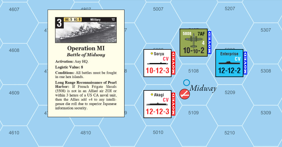 미드웨이에서 벌어진 개별 해전을 다룬 게임 뿐만 아니라, 태평양전쟁 전역을 다룬 게임에서도 미드웨이는 지정학적으로 중요한 위치로 등장합니다. 태평양전쟁 전체를 다룬 GMT Games의 '태양의 제국'의 작전 카드에는 미드웨이 공격을 의미하는 MI작전이 존재합니다.