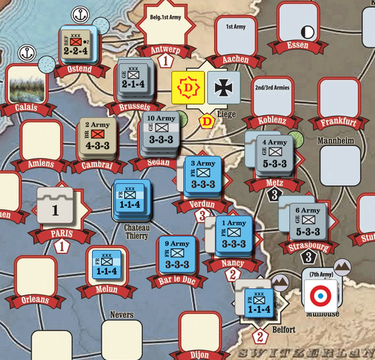 프랑스는 통상 독일군의 공세에 방어하는 입장인데, 굳이 공격을 해서 전력을 손실하게 되기 때문입니다. 따라서 공격에 유리한 곳이 없으면 군단 유닛 1개만 자살공격을 시켜서 피해를 최소화하는 방법이 주로 사용되는데, 군단의 손실도 손실인 만큼 AP 입장에서는 피하고 싶은 상황입니다.