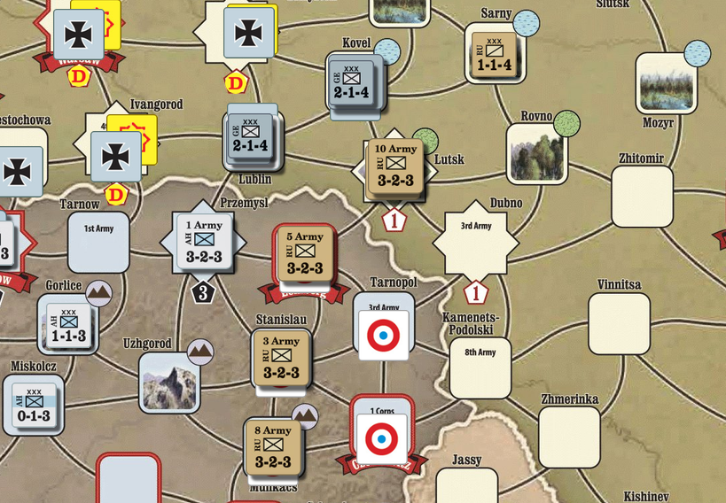 -CP: 3OP 사용, 브뤼셀 참호 시도(성공), 루블린과 코벨에서 루츠크 공격. 결과는 실망스러운 4/4로 루츠크의 러시아 제10군 스텝로스, 러시아군단 전멸, 독일 제9군 및 군단 각 스텝로스