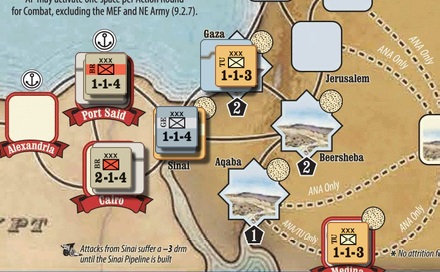 11턴, 알렉산드리아를 향하는 CP의 공세를 간신히 저지합니다. 앨런비의 영국군을 진작 불러왔어야 하는데, 시나이 파이프라인 카드를 이벤트로 사용하지 않았기 때문에 증원이 한참 늦어졌습니다.