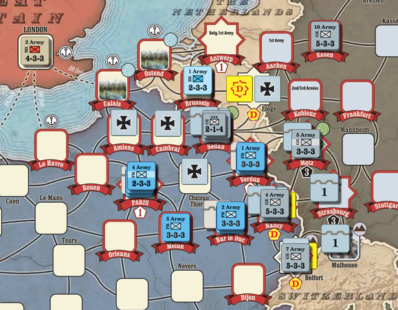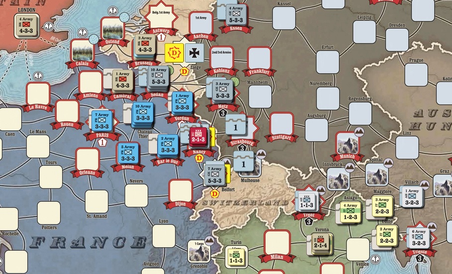 초반부터 서부전선이 불안불안하더니 Nancy를 독일군에게 빼앗기고 말았습니다. 1~2턴에서 프랑스군의 움직임에 문제가 있었던 것 같습니다.